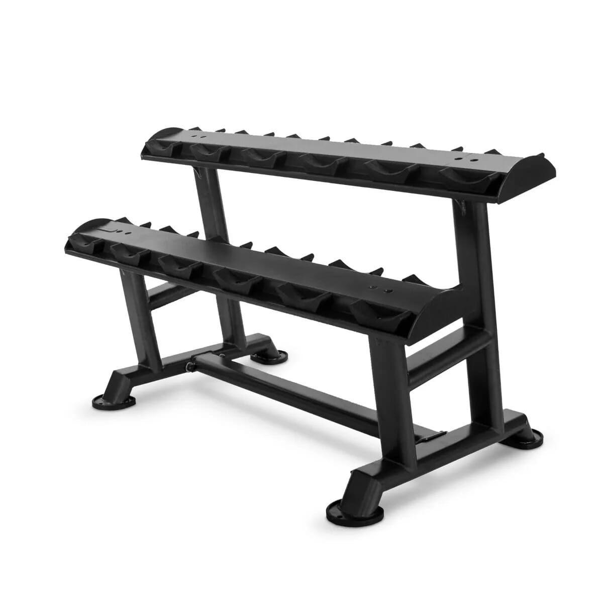 These dumbbell racks feature rubber saddles to protect and securely cradle each dumbbell.